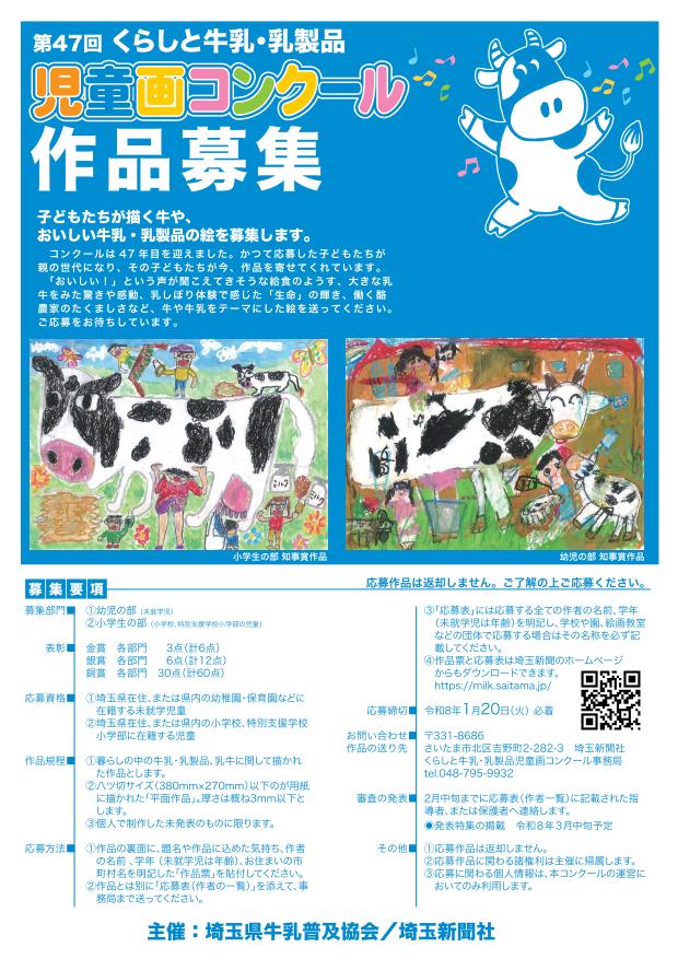 絵画コンクール 作品募集はじまるよ! お知らせ 2025.12.3 第47回(2025年度)くらしと牛乳・乳製品 児童画コンクールの作品募集が始まります。詳しくは、コンクールのページをご覧ください。 過去の作品をご覧になりたい方は、昨年度の全入賞作品を特別サイトで公開しています。参考にしてください。こちらから 熊谷駅ビルで児童画展開催中 >